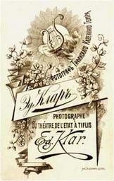 Keywords: ედუარდ კლარის ფოტოსტუდიის შტამპი. ტფილისი. 1910 წ.jpg ka ედუარდ კლარის ფ ტ სტუდიის შტამპი ტფილისი 1910 წ en Eduard Klar's photographic stamp Tiflis 1910 http //www photomuseum org ge/photographers/klar/klar_en htm www photomuseum org ge en http //www photomuseum org ge/photographers/klar/klar_ge htm www photomuseum org ge ge Eduard Klar 1861-1922 1910 Source http //www photomuseum org ge/ www photomuseum org ge PD-old Eduard Klar 1910 in Tbilisi Rustaveli Ave Tbilisi Photographic stamps in Georgia Photos of Eduard Klar