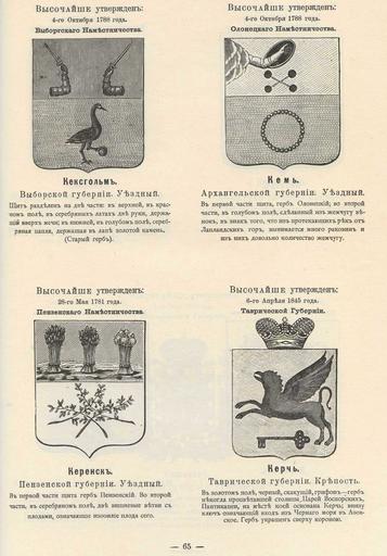 | Keywords: Кексгольм Кемь Керенск Керчь из Винклера.jpg Official Russian Empire coats of arms Ге бы го одов Российской Импе ии Кексгольм Кемь Ке енск Ке чь с официальными описаниями в Ге бовнике Винкле а П П фон-Винкле Ге бы го одов губе ний областей и посадов Российской Импе ии внесенные в Полное Соб ание законов с 1649 по 1900 год Дозволено цензу ою С -Пете бу г 20 Июля 1899 года Издание книгото говца Ив Ив Иванова С -Пете бу г Типог афия И Комелова П яжка д 3 1899 \ Scanned by Vizu 1899 published П П фон Винкле \ Pavel von Vinkler PD-old PD-RusEmpire PD-RU-exempt coats of arms Gerbovnik Vinklera - Pages 065 Coats of arms of Priozersk Kexholm Coats of arms of Olonets Governorate Coats of arms of Arkhangelsk Governorate Kem town Coats of arms of Penza Governorate Coats of arms of Tavria Governorate Coats of arms of Kerch |