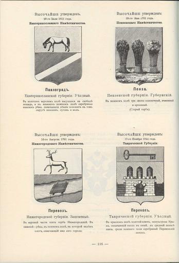 Keywords: Павлоград Пенза Перевоз Перекоп из Винклера.jpg Official Russian Empire coats of arms Ге бы го одов Российской Импе ии Павлог ад Пенза Пе евоз Пе екоп с официальными описаниями в Ге бовнике Винкле а П П фон-Винкле Ге бы го одов губе ний областей и посадов Российской Импе ии внесенные в Полное Соб ание законов с 1649 по 1900 год Дозволено цензу ою С -Пете бу г 20 Июля 1899 года Издание книгото говца Ив Ив Иванова С -Пете бу г Типог афия И Комелова П яжка д 3 1899 \ Scanned by Vizu 1899 published П П фон Винкле \ Pavel von Vinkler PD-old PD-RusEmpire PD-RU-exempt coats of arms Gerbovnik Vinklera - Pages 116 Coats of arms of Penza Governorate Coats of arms of Tavria Governorate