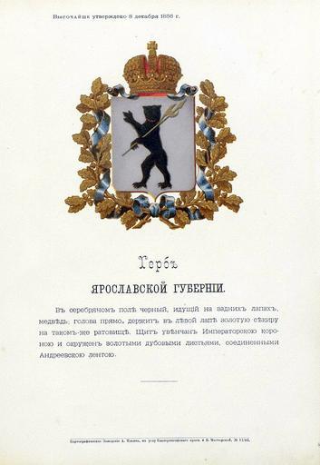 | Keywords: Ярославская губерния из Бенке.jpg Official Russian Empire coat of arms Yaroslavl Governorate Ге б Российской Импе ии Я ославской губе нии с официальным описанием в Ге бовнике Бенке Утве ждён Импе ато ом Все оссийским Александ ом Вто ым в 1856 году Ге бы губе ний и областей Российской Импе ии Отпечатано по аспо яжению минист а внут енних дел Санкт-Пете бу г Ка тог афическое заведение А А Ильина и типог афия инисте ства путей сообщения А Бенке 1880 / Scanned on paper album 1856-12-08 / 1880 published Russian Empire PD-old-100 PD-RusEmpire PD-RU-exempt coats of arms <gallery> File Я ославская_губе ния_ ВД_Бенке jpg File Я ославская губе ния изд Сукачова JPG File Coat of Arms of Yaroslavl gubernia Russian empire png </gallery> Coats of arms of Yaroslavl Governorate Gerbovnik Benke |
