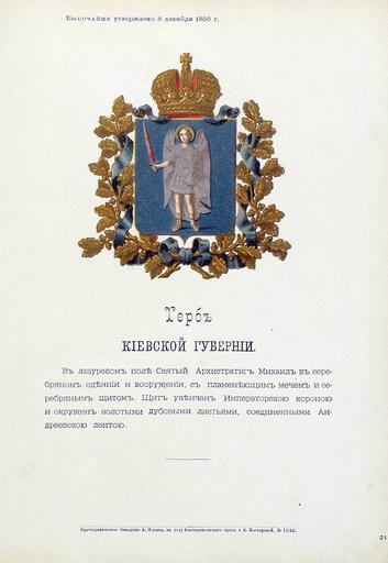 | Keywords: Киевская губерния из Бенке.jpg  Official Russian Empire coat of arms Kiev Governorate Ге б Российской Импе ии Киевской губе нии с официальным описанием в Ге бовнике Бенке Утве ждён Импе ато ом Все оссийским Александ ом Вто ым Ге бы губе ний и областей Российской Импе ии Отпечатано по  аспо яжению минист а внут енних дел Санкт-Пете бу г Ка тог афическое заведение А А Ильина и типог афия  инисте ства путей сообщения А Бенке 1880 / Scanned on paper album 1856 / 1880 published Russian Empire PD-old-100 PD-RusEmpire PD-RU-exempt coats of arms <gallery> File Киевская губ  ВД Бенке jpg File Киевская губе ния изд Сукачова JPG File Ге б Киевской губе нии 1856 Винкле jpg File Coat of Arms of Kiev Governorate png File Kyivsh_g png </gallery> <references/> Coats of arms of Kiev Governorate Gerbovnik Benke Saint Michael in heraldry Swords in heraldry |