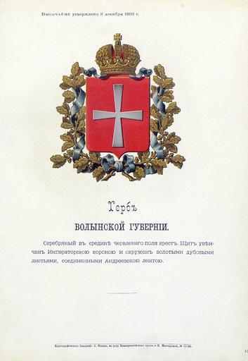 | Keywords: Волынская губерния из Бенке.jpg  Official Russian Empire coat of arms Volyn Governorate Ге б Российской Импе ии Волынской губе нии с официальным описанием в Ге бовнике Бенке Утве ждён Импе ато ом Все оссийским Александ ом Вто ым Ге бы губе ний и областей Российской Импе ии Отпечатано по  аспо яжению минист а внут енних дел Санкт-Пете бу г Ка тог афическое заведение А А Ильина и типог афия  инисте ства путей сообщения А Бенке 1880 / Scanned on paper album 1856 / 1880 published Russian Empire PD-old-100 PD-RusEmpire PD-RU-exempt coats of arms <references/> Coats of arms of Volyn Governorate Gerbovnik Benke Crosses in heraldry |
