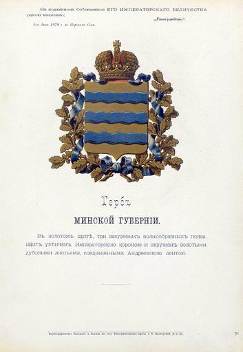| Keywords: Минская губерния из Бенке.jpg  Official Russian Empire coat of arms Minsk Governorate Ге б Российской Импе ии  инской губе нии с официальным описанием в Ге бовнике Бенке Утве ждён Импе ато ом Все оссийским Александ ом Вто ым Ге бы губе ний и областей Российской Импе ии Отпечатано по  аспо яжению минист а внут енних дел Санкт-Пете бу г Ка тог афическое заведение А А Ильина и типог афия  инисте ства путей сообщения А Бенке 1880 / Scanned on paper album 1878 / 1880 published Russian Empire PD-old-100 PD-RusEmpire PD-RU-exempt coats of arms Coats of arms of Minsk Governorate Gerbovnik Benke |