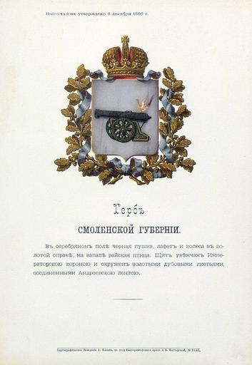 | Keywords: Смоленская губерния из Бенке.jpg  Official Russian Empire coat of arms Smolensk Governorate Ге б Российской Импе ии Смоленской губе нии с официальным описанием в Ге бовнике Бенке Утве ждён Импе ато ом Все оссийским Александ ом Вто ым Ге бы губе ний и областей Российской Импе ии Отпечатано по  аспо яжению минист а внут енних дел Санкт-Пете бу г Ка тог афическое заведение А А Ильина и типог афия  инисте ства путей сообщения А Бенке 1880 / Scanned on paper album 1856 / 1880 published Russian Empire PD-old-100 PD-RusEmpire PD-RU-exempt coats of arms <references/> Coats of arms of Smolensk Governorate Gerbovnik Benke Cannons in heraldry Paradisaea in heraldry |
