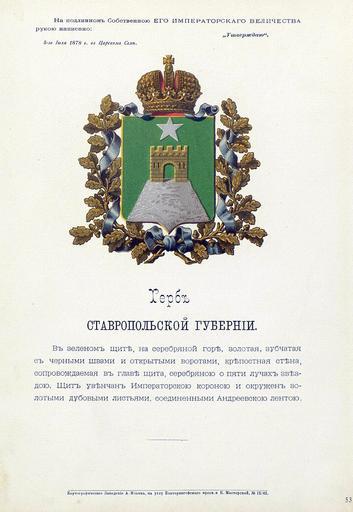 | Keywords: Ставропольская губерния из Бенке.jpg Official Russian Empire coat of arms Stavropol Governorate Ге б Российской Импе ии Став опольской губе нии с официальным описанием в Ге бовнике Бенке Утве ждён Импе ато ом Все оссийским Александ ом Вто ым Ге бы губе ний и областей Российской Импе ии Отпечатано по аспо яжению минист а внут енних дел Санкт-Пете бу г Ка тог афическое заведение А А Ильина и типог афия инисте ства путей сообщения А Бенке 1880 / Scanned on paper album 1878 / 1880 published Russian Empire PD-old-100 PD-RusEmpire PD-RU-exempt coats of arms <references/> Coats of arms of Stavropol Governorate Gerbovnik Benke 1 five rays argent in heraldry Towers in heraldry Mountains in heraldry |