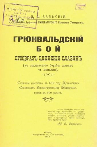 | Keywords: Обложка книги В.Ф.Залеского =Грюнвальдский бой...=.jpg ru Обложка книги Залеский В Ф Г юнвальдский бой - п ооб аз единения славян к тысячелетию бо ьбы славян с немцами - Казань Элект ическая типог афия Л П Антонова 1911 Обложка книги Скани овано И Е Алексеевым 17 декаб я 2005 г Книга издана в 1911 г PD-old Title pages from Russia Books from Russia 1911 | ||||