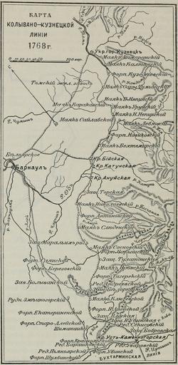 Keywords: Карта Колывано-Кузнецкой линии 1768 года.jpg Ка та Колывано-Кузнецкой линии 1768 года http //runivers ru/bookreader/book9617/ page/55/mode/1up Колывано-Кузнецкая пог аничная линия // Военная энциклопедия / Под ед В Ф овицкого и д Т 13 - СПб т-во И В Сытина 1913 - С 49 before 1913 author PD-RusEmpire PD-old Russian fortified lines