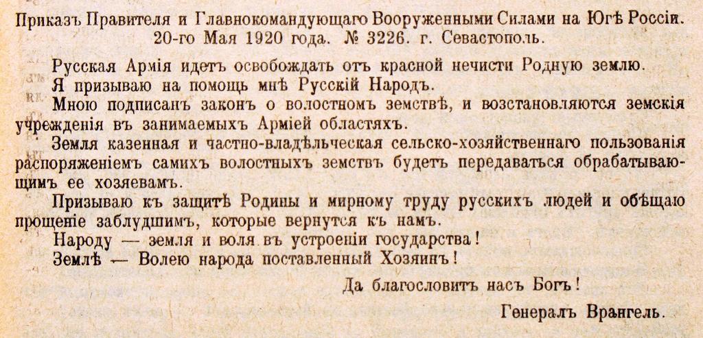 | Keywords: Приказ Врангеля о красной нечисти 1920.JPG ru Русская А мия идет освобождать от к асной нечисти Родную землю П иказ Главнокомандующаго Воо уженными Силами на Юге России П В ангеля 3226 от 20 мая 1920 года г Севастополь Выпущен пе ед выходом белой Русской А мии из К ыма высадкой десанта ген Слащова в Ки илловке 1920-05-20 А хив усской еволюции Гессена Бе лин т 5 1922 / own photo by Vizu Пёт иколаевич В ангель / Pyotr Nikolayevich Wrangel PD-old-70 PD-trivial <gallery>File Об ащение В ангеля о Хозяине 20 мая 1920 JPG</gallery> Civil war of Russia in Crimea Civil war of Russia 1920 1920 in Sevastopol Pyotr Nikolayevich Wrangel |
