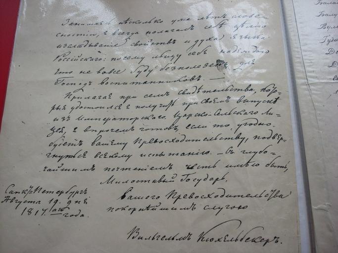 Keywords: Прошение Кюхельбекера, Вильгельма Карловича.jpg ru Ксе окопия п ошения Вильгельма Кюхельбеке а о п едоставлении ему должности п еподавателя словесности в Благо одном пансионе п и Главном педагогическом институте 19 августа 1817 г о игинал находится в ЦГИА СПб ф 13 оп 1 ед х 1793 19 августа 1817 School's Museum collection 321 School St Petersburg The address of museum 191119 Russia Saint-Petersburg Socialisticheskaya St 7 / Pravdy St 11 phone +7 812 764-86-38 e-mail sch321 center-edu/spb/ru Кюхельбеке Вильгельм Ка лович PD-1923 PD-old-70-1923 Uploaded with UploadWizard The First Saint-Petersburg Gymnasium St Petersburg Russia Wilhelm Küchelbecher Signatures of writers from Russia
