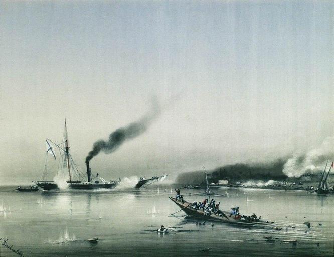 | Keywords: Пароход Колхида.jpg ru Па оход «Колхида» во в емя боя у поста Святого иколая в 1853 году Рисунок А П Боголюбова 1854 http //cardscccp narod ru/painters/ru/bogolubov7/6 html Боголюбов Алексей Пет ович PD-Old-100 Uploaded with UploadWizard Steamboats |