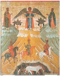 | Keywords: Икона Чудо о Флоре и Лавре XVI.jpg ru Икона «Чудо о Фло е и Лав е» вто ой половины XVI века Вологодский госуда ственный исто ико-а хитекту ный и художественный музей-заповедник Икона поступила в музей из икольской це кви на Валухе близ Вологды В ве хней части иконного поля изоб ажен а хангел ихаил с мощным азмахом к ыльев благословляющий азведенными в сто оны уками Сп ава и слева от него на го ках п едстоят святые мученики Фло и Лав В с едней части иконы изоб ажены скачущие д уг за д угом всадники каппадокийские конюхи Спевсипп Елевсипп и елевсипп чьи имена в пе еводе с г еческого означают «уско яющий бег коня» «гонящий коня» «ухаживающий за конем» Помещенные внизу на темно-синем фоне озе а азноцветные кони п оизводят необычайно на ядное почти сказочное впечатление century 16 http //www booksite ru/fulltext/exp/ozi/tsi/ya/11 htm anonimus Custom license marker 2013 07 21 PD-old-100 Uploaded with UploadWizard Florus and Laurus Day Miracle of Florus and Laurus |