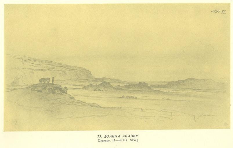 | Keywords: Долина Апазир.jpg uk Та ас Шевченко Долина Апази Тонований папі олівець 16 6 × 29 4 1 20 VI 1851 2014-03-07 17 34 06 http //izbornyk org ua/shevchenko/shev7 htm Creator Taras Shevchenko PD-old-100 Paintings by Taras Shevchenko Kazakhstan in art 1851 paintings in Ukraine Uploaded with UploadWizard |