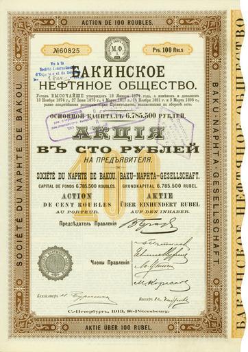 Keywords: Бакинское нефтяное общество, С.-Петербург, 1913, акция в 100 руб.jpg ru Titel Baku-Naphta-Gesellschaft / Société du Naphte de Bakou Titel Russisch Бакинское нефтяное общество Ort e St Petersburg Land Russland Aserbaidschan Beschreibung St -Petersburg 1913 Aktie über 100 Rubel 60825 34 6 x 23 8 cm braun ocker Stempel OU KR rechts Wellenschnitt dreisprachig Russisch Französisch Englisch Beschreibung Russisch С -Пете бу г 1913 акция в 100 уб 60825 34 6 x 23 8 см ко ичневый светло-ко ичневый печати подлинные подписи остатки купонов сп ава волнооб азный об ез на усском ф анцузском и английском языках 1913 Taken from http //www hwph de/historische-wertpapiere/losnr-auktnr-pa15-1292 html this site Бакинское нефтяное общество Custom license marker 2014 03 26 PD-old-100 Uploaded with UploadWizard 1913 in Baku