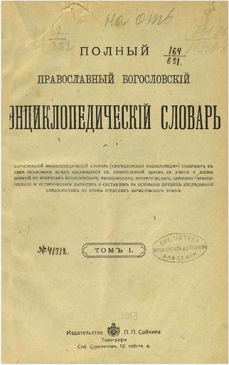 | Keywords: Полный православный богословский энциклопедический словарь, изданный в Санкт-Петербурге в 1913 году, издательством Петра Сойкина.png ru Полный п авославный богословский энциклопедический слова ь Титульный лист Пе вого тома 2014-04-11 17 15 30 http //dlib rsl ru/viewer/01004169245 page 2 Сойкин PD-Art Uploaded with UploadWizard Full Orthodox theological encyclopedia | ||||