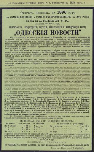 Keywords: Реклама газеты Одесские новости, 1896.jpg ru Реклама газеты Одесские новости 1896 год 2014-12-19 18 35 21 авто часть ссылка часть заглавие Ад есная книга го ода С -Пете бу га на 1896 год о игинал ссылка викитека ответственный Ред П О Яблонский издание место СПб издательство Лештуковская па овая ско опечатня П О Яблонского год 1896 том ст аницы столбцы ст аниц се ия ти аж author other versions PD-old-70-1923 Uploaded with UploadWizard Advertisements for newspapers of Russia History of Odessa