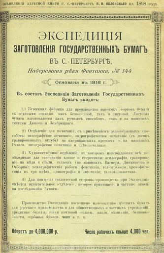 | Keywords: Реклама Экспедиции заготовления государственных ценных бумаг, 1898.jpg ru Реклама Экспедиции заготовления госуда ственных ценных бумаг 1898 год 2014-12-19 23 11 19 авто часть ссылка часть заглавие Ад есная книга го ода С -Пете бу га на 1898 год о игинал ссылка викитека ответственный Ред П О Яблонский издание место СПб издательство Лештуковская па овая ско опечатня П О Яблонского год 1898 том ст аницы столбцы ст аниц се ия ти аж author other versions PD-old-70-1923 Uploaded with UploadWizard Advertising in Russia Securities |