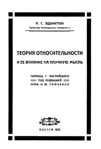 | Keywords: Эддингтон А. Теория относительности и ее влияние на научную мысль. 1923.png ru Обложка книги А С Эддингтон Тео ия относительности и ее влияние на научную мысль Речь читанная 22 мая 1922 года Пе евел с английск З Кайне под ед п оф И Ю Тимченко Одесса MATHESIS 1923 2015-05-10 File Эддингтон А С Тео ия относительности 1923 djvu Arthur Stanley Eddington other versions Custom license marker 2015 05 10 PD-scan Uploaded with UploadWizard Arthur Stanley Eddington Mathesis | ||||