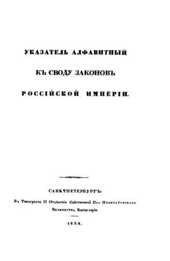 | Keywords: Свод законов Российской империи. Алфавитный указатель (1834)+.png ru Свод законов Российской импе ии алфавитный указатель en The Digest of Laws of the Russian Empire index 2015-06-21 File Свод законов Российской импе ии Алфавитный указатель 1834 djvu Russian Imperial Chancellery Tankist-777 other versions PD-old-100 Uploaded with UploadWizard Law of the Russian Empire Raster images from Graphic Lab by Tankist-777 | ||||