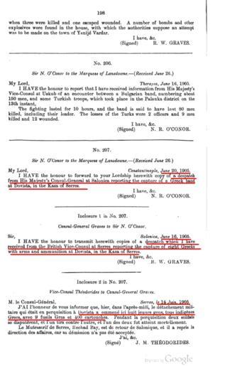 Keywords: Τηλεγράφημα του πρόξενου της Βρετανίας με την είδηση της σύλληψης ομάδας Μακεδονομάχων στη Δοβίστα.GIF el Τηλεγράφημα του ροξένου της Βρετανίας στις Σέρρες Ι Θεοδωρίδη ρος τον Γενικό Πρόξενο της Βρετανίας στη Θεσσαλονίκη με το ο οίο τον ληροφορεί για τη σύλληψη ομάδας ακεδονομάχων στη Δοβίστα α ό α όσ ασμα του οθωμανικού στρατού στις 13 Ιουνίου 1905 en Telegram of the British vice-consul in Serres I Theodorides to the General Consul in Salonica R Graves containing the news of the arrest of a Greek band of Makedonomakhoi Macedonian-fighters by Ottoman troops at Dovista on June 13 1905 1906 Parliamentary papers 1850-1908 volume 137 Great Britain Parliament House of Commons other versions PD-old-70-1923 Uploaded with UploadWizard Uncategorized 2015 July 15 |