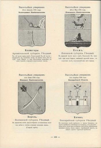 | Keywords: Холмогоры Холм Хороль Хотин из Винклера.jpg Official Russian Empire coats of arms Ге бы го одов Российской Импе ии Холмого ы Холм Хо оль Хо ол Хотин - с официальными описаниями в Ге бовнике Винкле а П П фон-Винкле Ге бы го одов губе ний областей и посадов Российской Импе ии внесенные в Полное Соб ание законов с 1649 по 1900 год Дозволено цензу ою С -Пете бу г 20 Июля 1899 года Издание книгото говца Ив Ив Иванова С -Пете бу г Типог афия И Комелова П яжка д 3 1899 \ Scanned by Vizu 1899 published П П фон Винкле \ Pavel von Vinkler PD-old PD-RusEmpire PD-RU-exempt Gerbovnik Vinklera - Pages 162 Khorol |