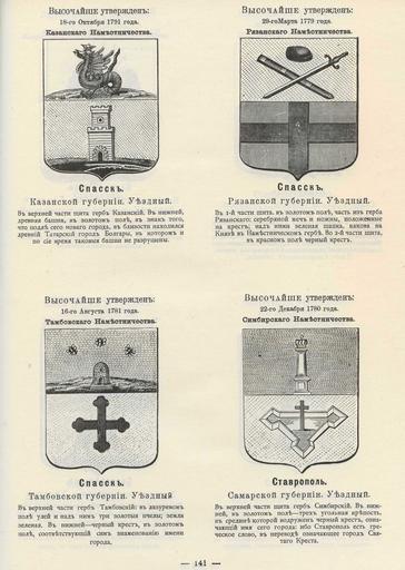 | Keywords: Спасск Казанский Рязанский Тамбовский Ставрополь из Винклера.jpg Official Russian Empire coats of arms Ге бы го одов Российской Импе ии Спасск т и го ода Став ополь - с официальным описанием в Ге бовнике Винкле а П П фон-Винкле Ге бы го одов губе ний областей и посадов Российской Импе ии внесенные в Полное Соб ание законов с 1649 по 1900 год Дозволено цензу ою С -Пете бу г 20 Июля 1899 года Издание книгото говца Ив Ив Иванова С -Пете бу г Типог афия И Комелова П яжка д 3 1899 \ Scanned by Vizu 1899 published П П фон Винкле \ Pavel von Vinkler PD-old PD-RusEmpire PD-RU-exempt Gerbovnik Vinklera - Pages 141 Spassk Penza Oblast Spassk-Ryazansky Symbols of Tolyatti |
