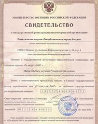 | Keywords: Свидетельство о государственной регистрации Республиканской партии России от 05.05.2012.jpg Свидетельство о госуда ственной егист ации Республиканской па тии России от 05 05 2012 http //svobodanaroda org/news/3397/ 05 05 2012 инюст РФ PD-RU-exempt People's Freedom Party |