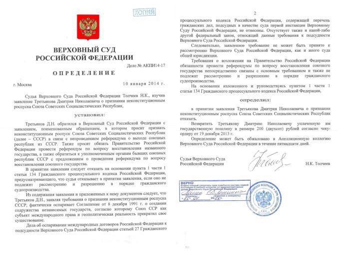 Keywords: ОПРЕДЕЛЕНИЕ ВЕРХОВНОГО СУДА РФ № АКПИ 1417 от 10.01.2014.png ru Оп еделение Ве ховного Суда России АКПИ 14-17 от 10 янва я 2014 года об отказе п инять от Г ажданина России заявление О неконституционном оспуске СССР ссылаясь на ГПК РФ статью 134 пункт 1 оспа ивающиеся акты не зат агивают п ава и свободы или законные инте есы заявителя en The answer of the Supreme Court of Russia on refusal to accept from a Russian Citizen the statement On the unconstitutional dissolution of the Soviet Union 10 January 2014 2014-01-10 own Dgeise Official documents 200px PD-RU-exempt cc-by-sa-4 0 Unconstitutional dissolution of the Soviet Union