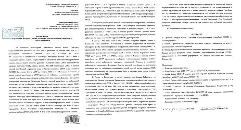 | Keywords: ОБРАЩЕНИЕ (ЗАЯВЛЕНИЕ) В ВЕРХОВНЫЙ СУД РФ О ПРИЗНАНИИ РОСПУСКА СССР НЕКОНСТИТУЦИОННЫМ.png ru Об ащение заявление в Ве ховный Суд Российской Феде ации О п изнании оспуска СССР неконституционным от 19 декаб я 2013 г от жителя го ода Тольятти Дмит ия Т етьякова 1981 года ождения en Statement to in the Supreme Court of the Russian Federation On recognition of the dissolution of the Soviet Union unconstitutional of 19 December 2013 from a citizen of city Togliatti Samara region Dmitry Tretyakov 1981 year of birth 2013-12-19 own Dgeise Official documents 200px PD-RU-exempt cc-by-sa-4 0 Unconstitutional dissolution of the Soviet Union |