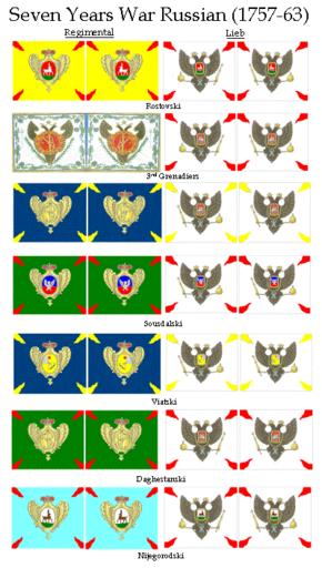 | Keywords: Знамя России Мушкетер полкам 1730 г (Семилетняя война).gif Flags of the Russian Musketeer Regiments 1730 Seven Years War Rostovski Rostov 3rd Grenadiers Nasheburgskii Nasheburg Soudalski Suzdal Viatski Daghestamski Daghestam Nijegorodski Nijegorod ru Знамя России ушкете полкам 1730 г Семилетняя война Полков 3-й г енаде ский Nasheburg Суздаль Viatski Дагестан ижего одское 1730 http //www warflag com/flags/syw/sywrrus1 shtml Анна Иоанновна other versions insignia PD-RusEmpire Flag charts of Russia Flags of the Russian Musketeer Regiments 1730 pattern |
