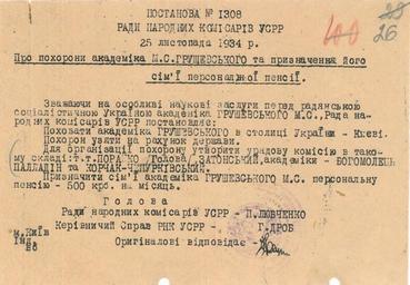 | Keywords: Постанова Ради Народних Комісарів УСРР «Про похорони академіка М. Грушевського та призначення його сім’ї персональної пенсії».jpg uk 1934 листопада 25 Постанова Ради а одних Коміса ів УСРР П о похо они академіка Г ушевського та п изначення його сім ї пе сональної пенсії ЦДАГО Ук аїни ф 1 оп 20 сп 6463 а к 26 1934-11-25 http //www archives gov ua/Sections/Grushevsky/index php 95 photo Рада а одних Коміса ів УСРР other versions Custom license marker 2016 10 02 PD-Ukraine Documents of Mykhaylo Hrushevskyy |