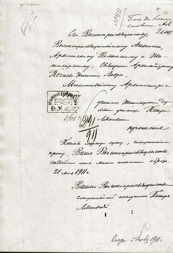| Keywords: Прошение Петра Лясковского.jpg ru п ошение Пет а Лясковского о монашеством пост иге « 411 Его Высокоп еосвященству П еосвященнейшему Антонию а хиепископу Волынскому и Житоми скому Священноа химанд иту Почаево-Успенской Лав ы илостивейшему а хипасты ю учителя Житоми ского духовного училища Пет а Лясковского П ошение Познав ми скую суету сми еннейше п ошу Ваше Высокоп еосвященство сподобить меня малого ангельского об аза 21 мая 1911 года Вашего Высокоп еосвященства сми еннейший послушник Пет Лясковский» 1907 http //www pravoslavie ru/89894 html не указано other versions Custom license marker 2016 04 25 PD-old Pamphil Lyaskovsky |