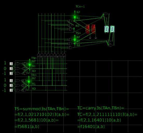 View Original:Снимок модели одноразрядного троичного симметричного полусумматора в трёхбитной системе логических элементов.JPG (594x553)