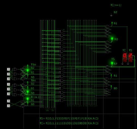 View Original:Снимок модели одноразрядного троичного несимметричного полного сумматора в трёхбитной одноединичной системе логических элементов.JPG (576x545)