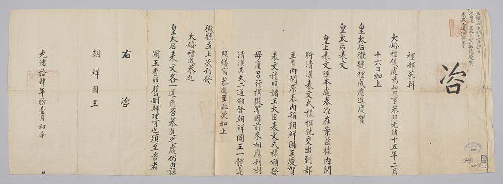 | Keywords: 조선-청 외교문서(자문) 072.jpg 고종 25년 1888 11월 7 에 청국 예 에 조선국왕에게 보내 온 문 광 光緖 혼 후에 황 후 호를 상하는 에 해 경하하는 表式 청 淸 · 漢 양문 兩文 2통 반급 다고 알리는 내용 다 2016-07-18 http //www nl go kr/nl/search/SearchDetail nl category_code ct service KOLIS vdkvgwkey 1129971 colltype DAN_OLD place_code_info 172 place_name_info EB 94 94 EC A7 80 ED 84 B8 EC 97 B4 EB 9E 8C EC 8B A4 manage_code MA shape_code B refLoc null category srchFlag Y h_kwd E5 8F A4 E6 9C 9D51- EB 8B A428-86 lic_yn N mat_code RB 국립중앙도 조선국왕 수급 청국예 급 other versions PD-Art Books from National Library of Korea Books from Korea 1888 in Relations of the Joseon Dynasty and the Qing Dynasty |