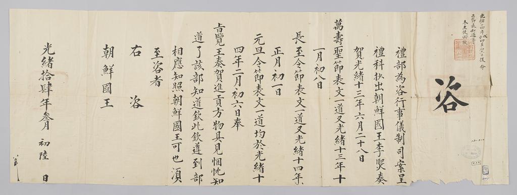 | Keywords: 조선-청 외교문서(자문) 144.jpg 고종 25년 1888 3월 6 에 청국 예 에 조선국왕에게 보내 온 문 황 께 삼절 三 表 만수성절 장 령절 원단령절 3도 道 를 아뢰었더니 알았다고 전하는 내용 다 2016-07-18 http //www nl go kr/nl/search/SearchDetail nl category_code ct service KOLIS vdkvgwkey 1129996 colltype DAN_OLD place_code_info 172 place_name_info EB 94 94 EC A7 80 ED 84 B8 EC 97 B4 EB 9E 8C EC 8B A4 manage_code MA shape_code B refLoc null category srchFlag Y h_kwd E5 8F A4 E6 9C 9D51- EB 8B A428-210 lic_yn N mat_code RB 국립중앙도 조선국왕 청국예 other versions PD-Art Books from National Library of Korea Books from Korea 1888 in Relations of the Joseon Dynasty and the Qing Dynasty |