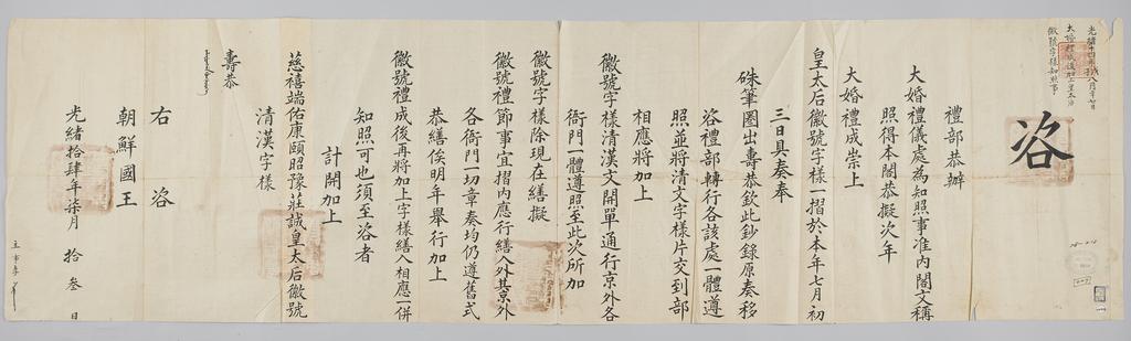 | Keywords: 조선-청 외교문서(자문) 151.jpg 고종 25년 1888 7월 13 에 청국 예 에 조선국왕에게 보내 온 문 황상 皇上 혼 大婚禮 후에 황 후에게 존호를 올리는 자양 字樣 확 해 알려주는 내용 다 2016-07-18 http //www nl go kr/nl/search/SearchDetail nl category_code ct service KOLIS vdkvgwkey 1129991 colltype DAN_OLD place_code_info 172 place_name_info EB 94 94 EC A7 80 ED 84 B8 EC 97 B4 EB 9E 8C EC 8B A4 manage_code MA shape_code B refLoc null category srchFlag Y h_kwd E5 8F A4 E6 9C 9D51- EB 8B A428-218 lic_yn N mat_code RB 국립중앙도 조선국왕 청국예 other versions PD-Art Books from National Library of Korea Books from Korea 1888 in Relations of the Joseon Dynasty and the Qing Dynasty |