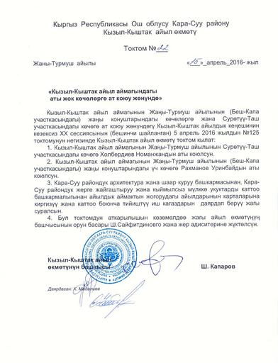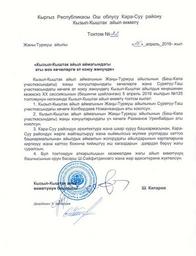 View Original:Постановление Кызыл-Кыштакской сельской управы Кара-Суйского района Ошской области Кыргызстана №22 от 15 апреля 2016 года.jpg (1200x1568)