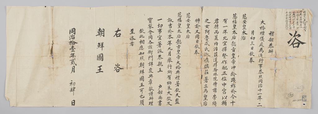 | Keywords: 조선-청 외교문서(자문) 207.jpg 고종 9년 1872 2월 4 에 청국 예 에 조선국왕에게 보내 온 문 두 황 후 皇太后 慈安皇太后 慈禧皇太后 懿旨 를 받들어 혼 大婚禮 를 올 9월에 거행하려고 하니 각 해당 아문 衙 에 전장 典章 잘 살펴 비하 는 알리는 내용 다 왕세손 나 왕 비·왕비 명령 내 內旨 자 慈旨 徽旨 고도 함 자안황 후 1837~1881 청나 9 황 함풍 咸豊 황후 동 후 太后 불림 자 황 후 1835~1908 청나 함풍 후궁 며 동치 同治 모 명 후 西太后 명함 2016-07-19 http //www nl go kr/nl/search/SearchDetail nl category_code ct service KOLIS vdkvgwkey 1130385 colltype DAN_OLD place_code_info 172 place_name_info EB 94 94 EC A7 80 ED 84 B8 EC 97 B4 EB 9E 8C EC 8B A4 manage_code MA shape_code B refLoc null category srchFlag Y h_kwd E5 8F A4 E6 9C 9D51- EB 8B A428-284 lic_yn N mat_code RB 국립중앙도 조선국왕 청국예 other versions PD-Art Books from National Library of Korea Books from Korea 1872 in Relations of the Joseon Dynasty and the Qing Dynasty |
