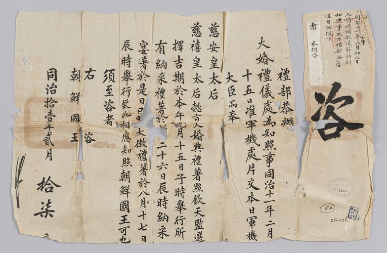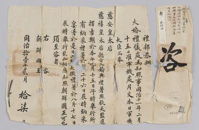 | Keywords: 조선-청 외교문서(자문) 209.jpg 고종 9년 1872 2월 17 에 청국 예 에 조선국왕에게 보내 온 문 두 황 후 를 받들어 황 혼 大婚禮 길 吉日 9월 15 정해졌 니 혼 납채 納采 징 大徵禮 등 반 절 에 해 알리는 내용 다 2016-07-19 http //www nl go kr/nl/search/SearchDetail nl category_code ct service KOLIS vdkvgwkey 1130380 colltype DAN_OLD place_code_info 172 place_name_info EB 94 94 EC A7 80 ED 84 B8 EC 97 B4 EB 9E 8C EC 8B A4 manage_code MA shape_code B refLoc null category srchFlag Y h_kwd E5 8F A4 E6 9C 9D51- EB 8B A428-286 lic_yn N mat_code RB 국립중앙도 조선국왕 청국예 other versions PD-Art Books from National Library of Korea Books from Korea 1872 in Relations of the Joseon Dynasty and the Qing Dynasty |