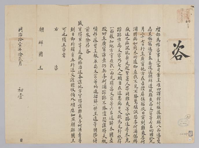 | Keywords: 조선-청 외교문서(자문) 287.jpg 고종 9년 1872 12월 1 에 청국 예 에 조선국왕에게 보내 온 문 조선 민 고문종 등 7명 환국 還 키려고 데리고 던 중 광녕 廣寗 방에 도착해 그 중 하포 何浦 는 자 행방불명되어 고문종 등 6명만 본국 보내고 남 하포 행적 찾고 있다고 알리는 내용 다 2016-07-19 http //www nl go kr/nl/search/SearchDetail nl category_code ct service KOLIS vdkvgwkey 1130361 colltype DAN_OLD place_code_info 172 place_name_info EB 94 94 EC A7 80 ED 84 B8 EC 97 B4 EB 9E 8C EC 8B A4 manage_code MA shape_code B refLoc null category srchFlag Y h_kwd E5 8F A4 E6 9C 9D51- EB 8B A428-369 lic_yn N mat_code RB 국립중앙도 조선국왕 청국예 other versions PD-Art Books from National Library of Korea Books from Korea 1872 in Relations of the Joseon Dynasty and the Qing Dynasty |