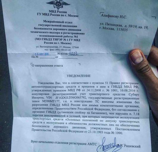| View Original: | Уведомление об аннулировании регистрационного учета автомобиля за установку спойлера на багажник.jpg (1242x1195) | |||