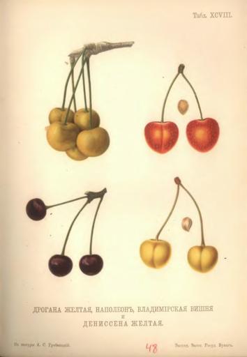 | Keywords: Дрогана жёлтая, Наполеон, Владимирская вишня и Дениссена жёлтая.gif ru Д огана жёлтая аполеон Владими ская вишня и Дениссена жёлтая 1906 Атлас плодов под едакцией Адама Г ебницкого Адам Г ебницкий other versions Custom license marker 2016 01 20 PD-RusEmpire Prunus cultivars Prunus avium - botanical illustrations Atlas of fruit |