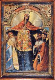 Keywords: Перша пол. XVIII ст. Київщина. Дошка липова, левкас, темпера, олія, різьблення, сріблення, позолота. 109 х 76 х 4 (в обрамленні). The Intercession with the portrait of Hetman Bohdan Khmelnytsky. The first half of the 18th c. Kyivshchyna. Tempera, oil, silvering, gilding on three-piece lime-wood panel, carving. Національний художній музей України. Альбом. Київ, "Артанія Нова", 2003. icon |