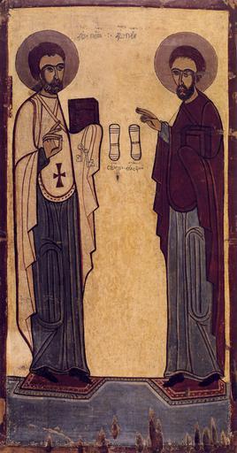 Keywords: Кінець XV ст. Галичина. Дошка липова, левкас, темпера. 90 х 47 х 3,5. The Apostles Peter and Paul. Late 15th c. Galychyna. Tempera on gesso-grounded canvas pasted to the lime-wood panel. Національний художній музей України. Альбом. Київ, "Артанія Нова", 2003 |