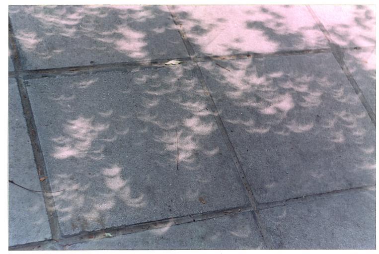 Keywords: σκιές σκιέσ shadows total sun eclipse οι σκιές των φυλλωμάτων των δέντρων παίρνουν αυτό το σχήμα (πολλαπλά είδωλα του καλυμμένου από το φεγγάρι ήλιου) όταν η έκλειψη είναι σχεδόν ολική ή λίγο πριν και λίγο μετά την ολική. οι σκιές των φυλλωμάτων των δέντρων παίρνουν αυτό το σχήμα (πολλαπλά είδωλα του καλυμμένου από το φεγγάρι ήλιου) όταν η έκλειψη είναι σχεδόν ολική ή λίγο πριν και λίγο μετά την ολική. |