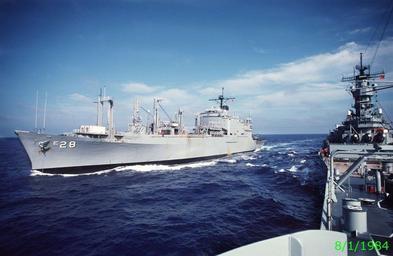 Keywords: A port bow view of the ammunition ship USS SANTA BARBARA (AE 28) as it provides ammunition for the battleship USS IOWA (BB 61) during an underway replenishment.