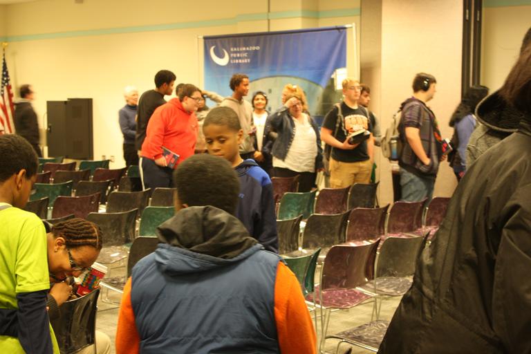 | Keywords: Award-winning author Jason Reynolds returned to Kalamazoo on Wednesday, April 13, 2016, for a Meet the Author event at Central Library. Jason recently received the prestigious Walter Dean Myers Award for Outstanding Children’s Literature, and the American Library Association’s 2016 Coretta Scott King Honor Award for outstanding African American authors. Photo by Farrell Howe. www.kpl.gov Award-winning author Jason Reynolds returned to Kalamazoo on Wednesday, April 13, 2016, for a Meet the Author event at Central Library. Jason recently received the prestigious Walter Dean Myers Award for Outstanding Children’s Literature, and the American Library Association’s 2016 Coretta Scott King Honor Award for outstanding African American authors. Photo by Farrell Howe. www.kpl.gov |