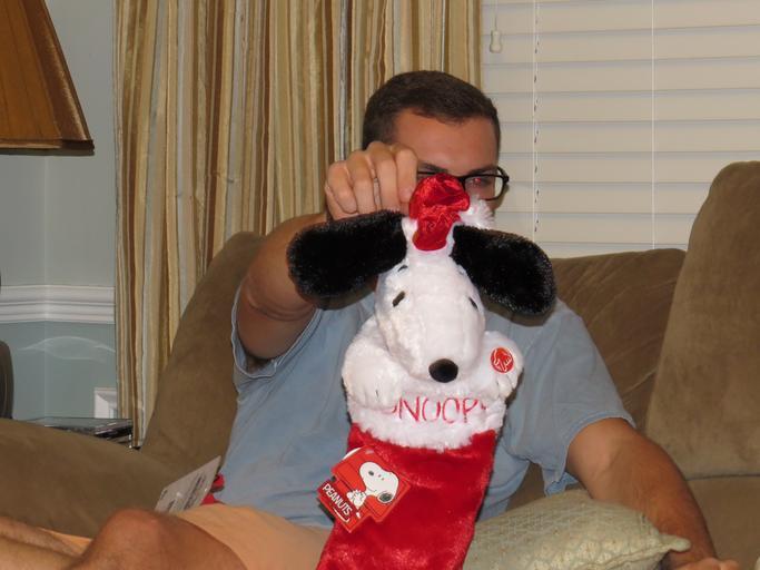 Keywords: Ryan Deci showing Bryant his new Snoopy musical Christmas stocking