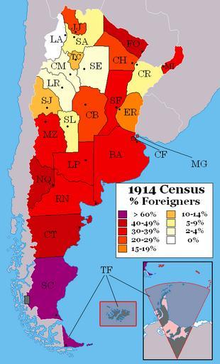 Keywords: Immigrants in Argentina (1914).PNG es La imagen presenta un mapa coloreado de acuerdo al porcentaje de immigrantes empadronados en el Tercer Censo de la República Argentina llevado a cabo en 1914 en The image shows a map colored according to the percentage of immigrants registered in the Third Census of the Argentine Republic conducted ‹ ‹in 1914 2015-04-15 own Inhakito other versions 100px cc-zero Uploaded with UploadWizard Maps of subdivisions of Argentina 1914 in Argentina Immigrants to Argentina Demographic maps of Argentina |