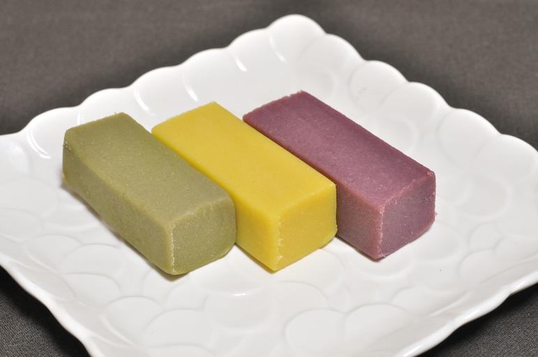 Keywords: Imo-yōkan 001.jpg ja 芋羊羹三種 左から抹茶 常の芋羊羹 紫芋羊羹 2016-10-24 22 20 33 own Ocdp other versions cc-zero Yōkan